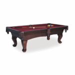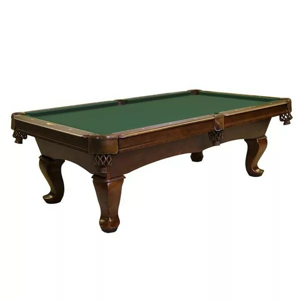 Double arched cabinet with Queen Anne legs. Solid wood frame supports, legs, rails and blinds. Shown in Warm Chestnut finish with Dark Green Cloth. (Other cloth colors available) Also available in Traditional Mahogany, Warm Chestnut & Black finishes in 7 & 8 foot models.